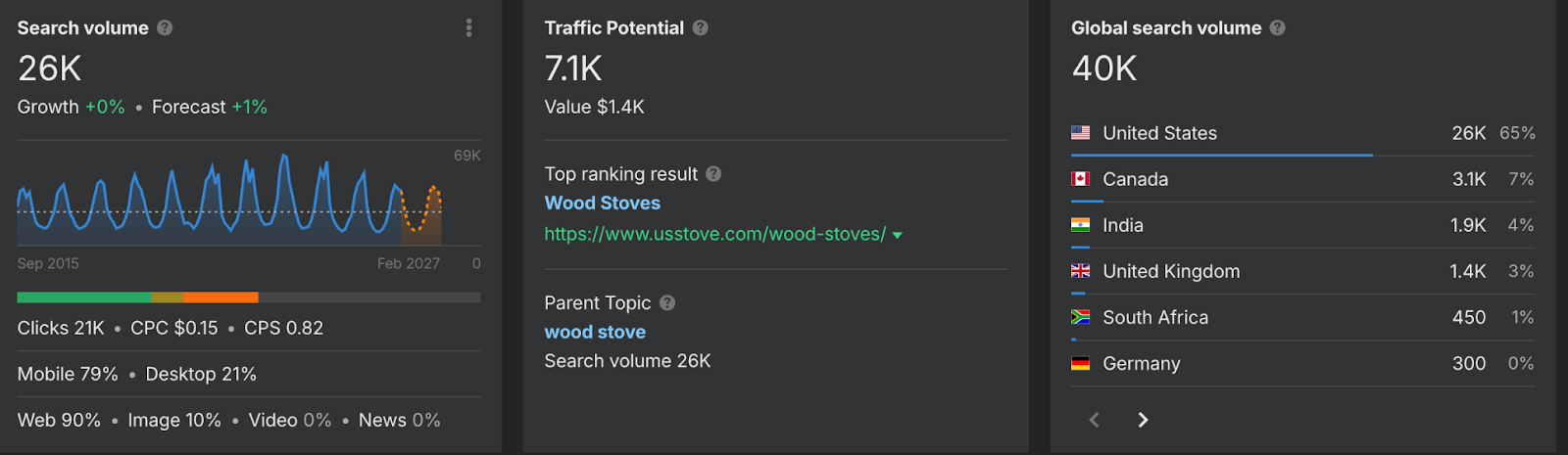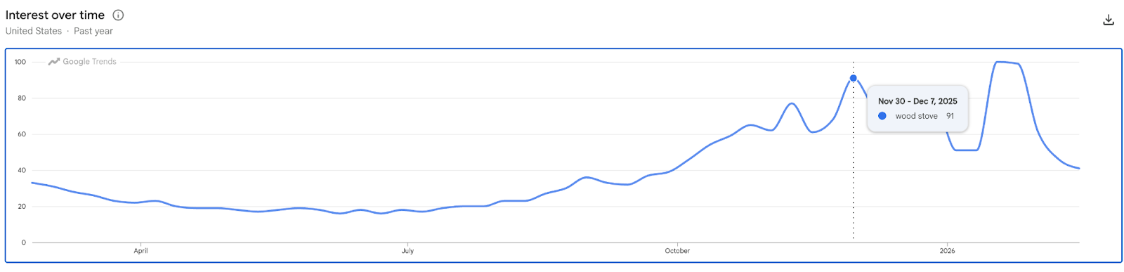 There are around 26,000 searches per month for wood stoves on average over the trailing 12 months, but that number tells only part of the story.