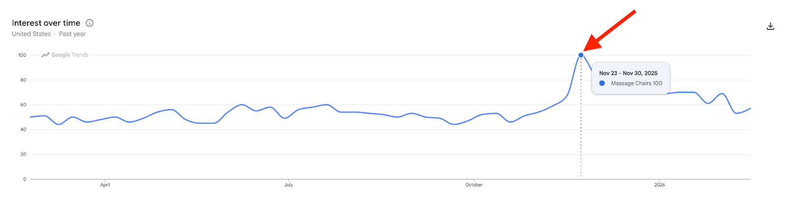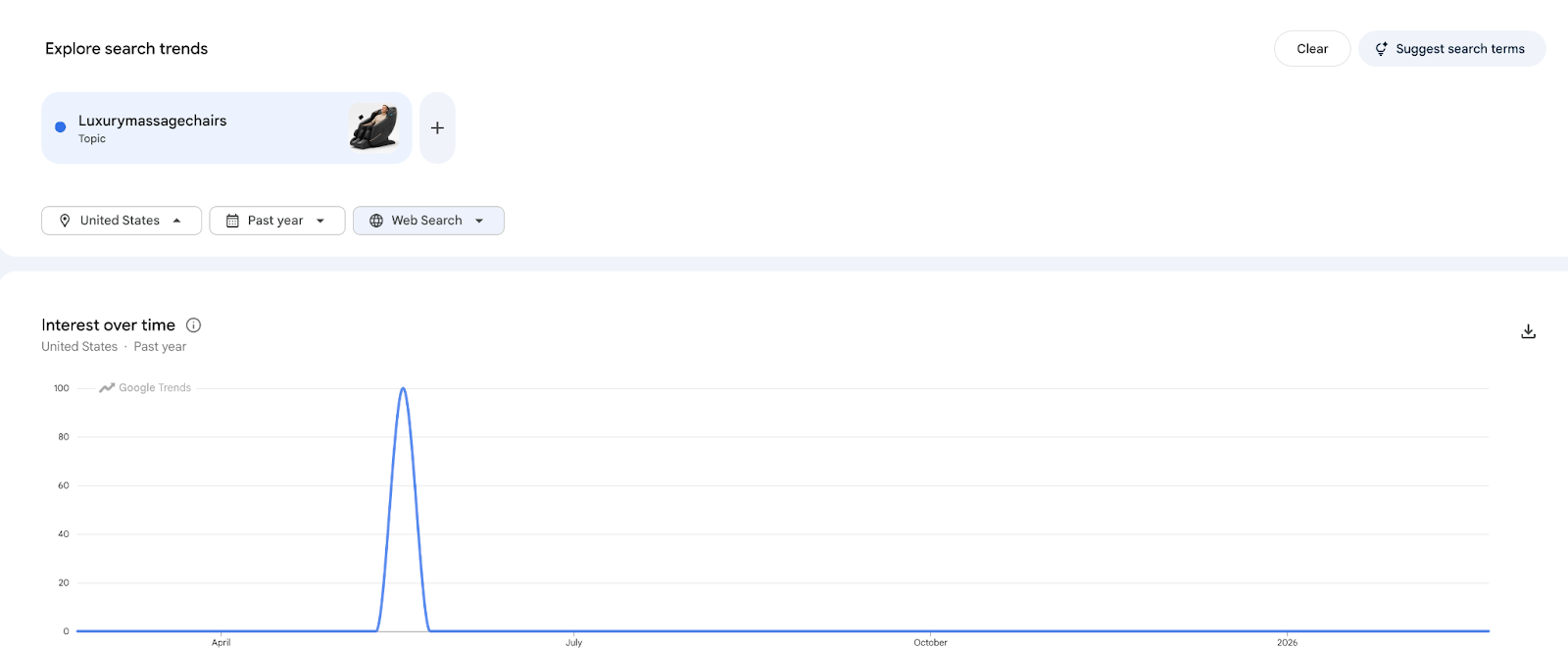 Looking outside your scope of expertise is a little harder, but it can be key to finding a profitable niche. You can use Google Trends to see how well people are searching for the terms in your niche. Toss in a keyword, and it'll show you data like search volume and related queries, broken down by region if you need it, to see if there's enough interest in a topic to justify creating a product around it. See the analytics for "Luxury massage chairs."