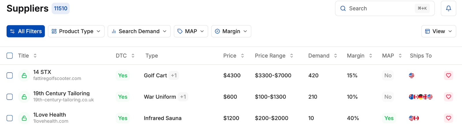 You'll also get the top suppliers for each product on the same page, including their price range, profit margin, MAP, and shipping location: